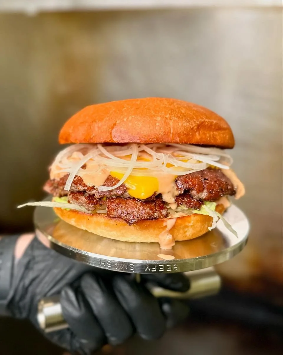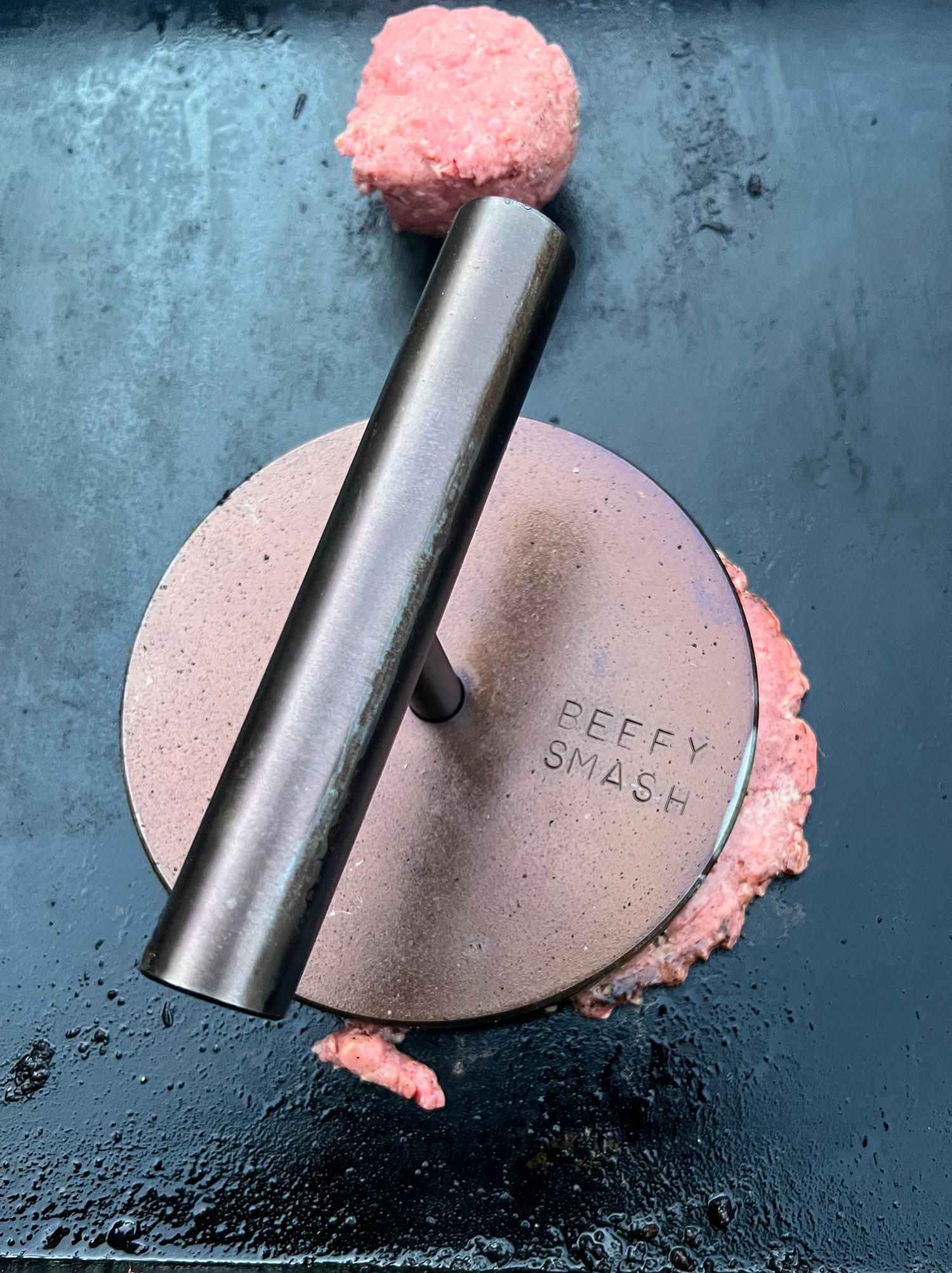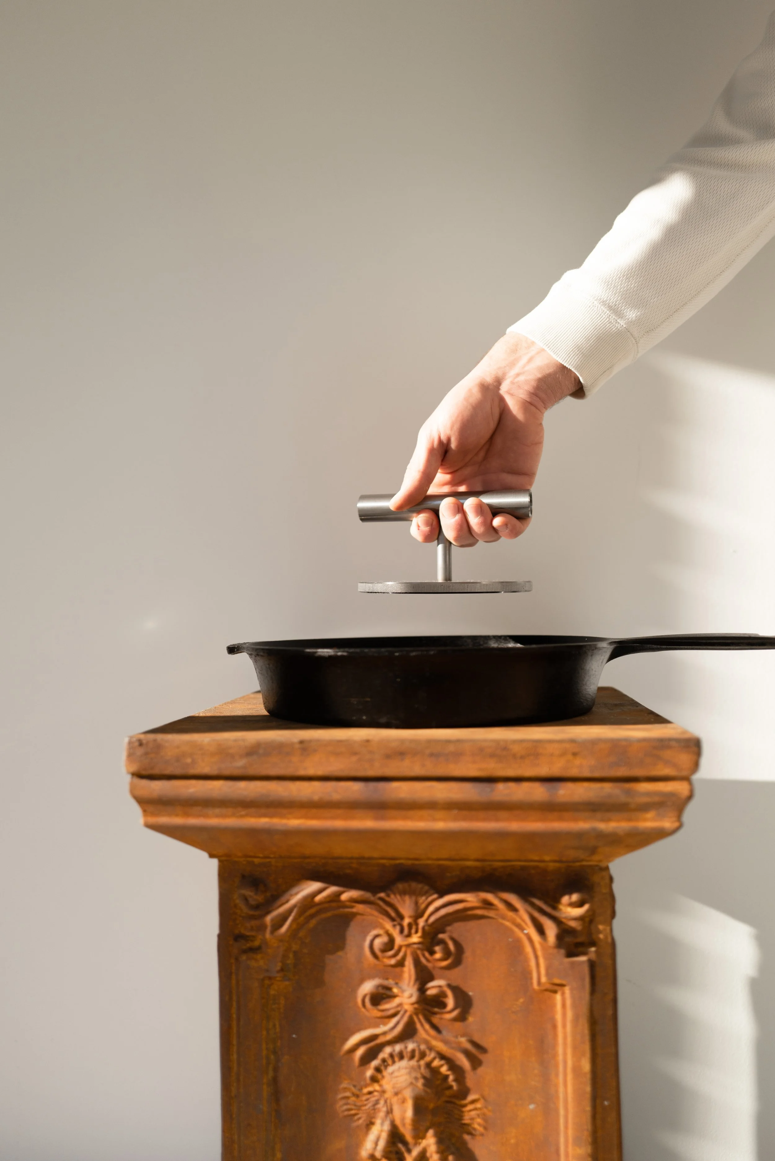 BEEFY SMASH is the ultimate heavy duty culinary tool smashing and searing. Machined from solid 304 Stainless Steel and weighs in at 4.25 pounds. Place it onto any food items in a hot pan to achieve a crispy sear. The weight does the job itself without requiring any additional pressure. You can use it for anything from smash burgers, chicken breast, panini, pancake, tortilla, mashed potatoes, and pressing water out of tofu.
